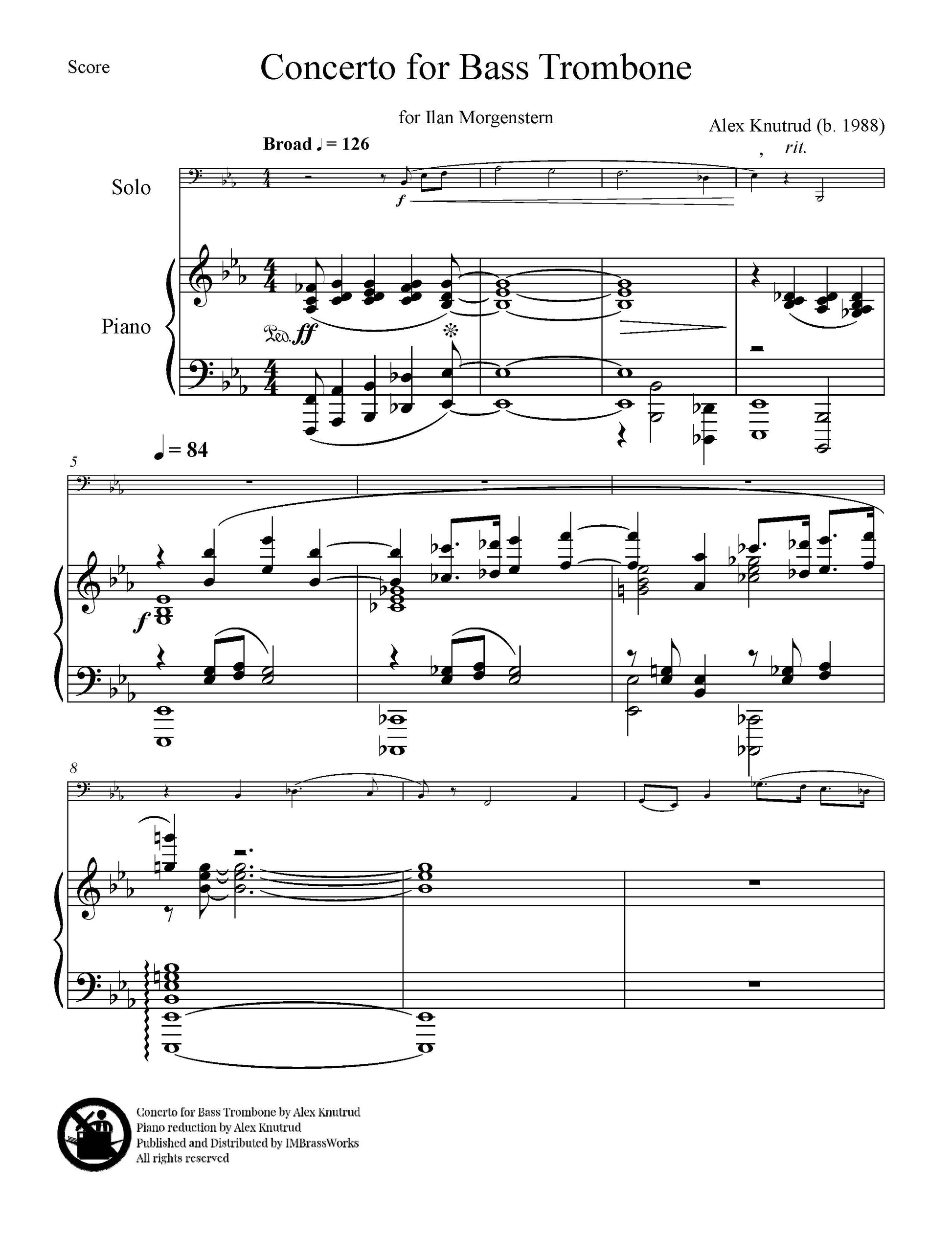 Atractive and evocative new music for Bass Trombone: What could be better! Originally for Bass Trombone and Band, this piano reduction by the composer captures the beauty and complexity of the work well. A modern must! Thank you for a great work, Alex!!