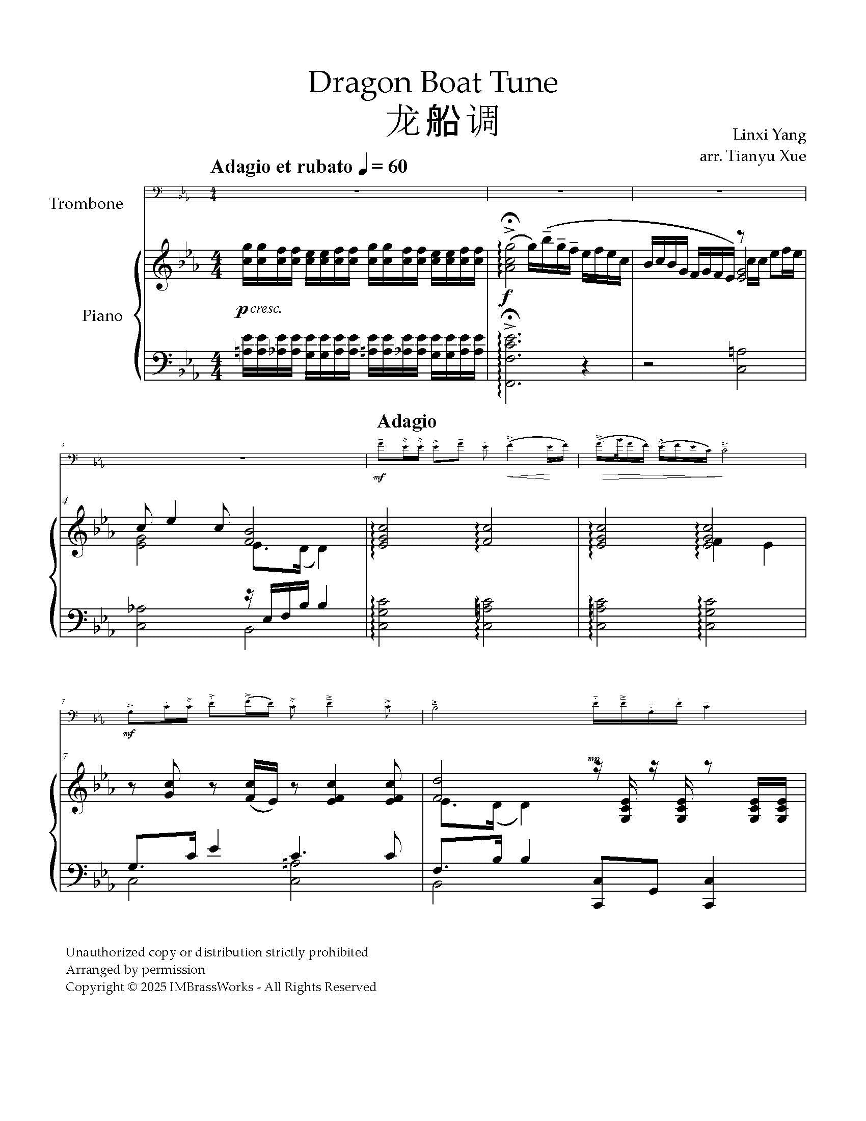 Linxi Yang arr. Xue: Three Chinese Folk Melodies: Dragon Boat Tune, Flowers, Why Are You So Bright Red, The Swan Goose for Trombone and Piano