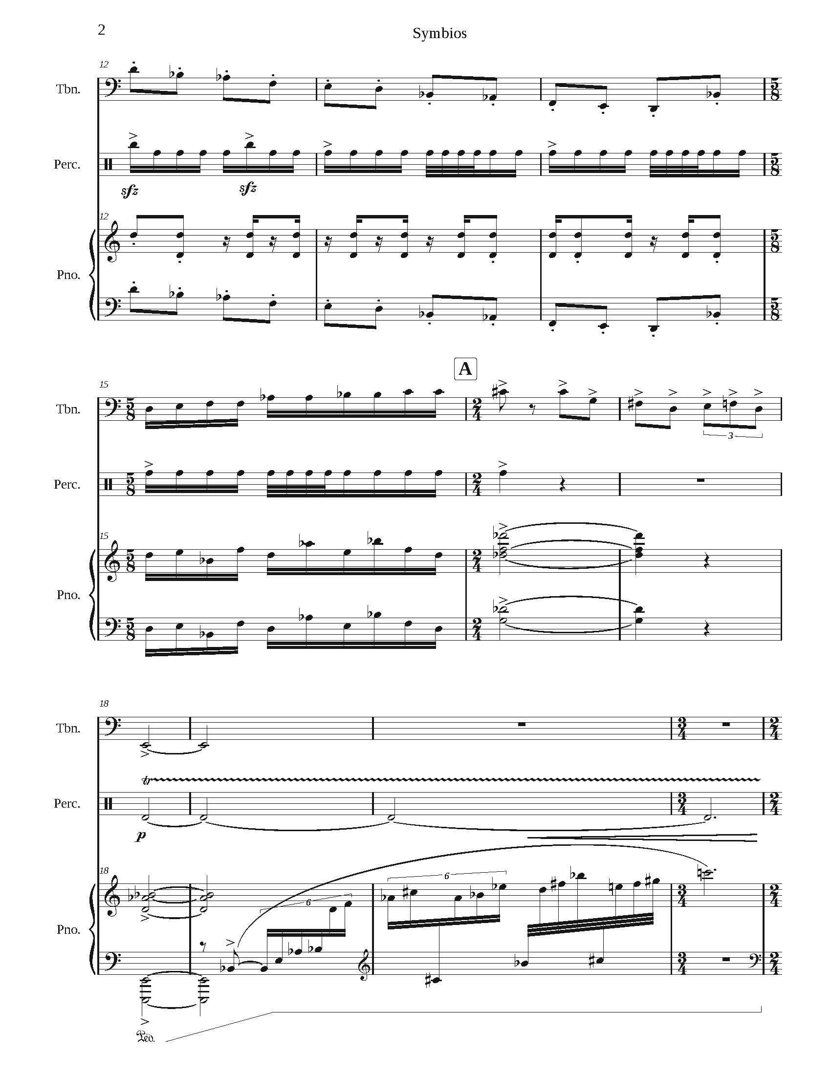 Symbios for trombone, piano and percussion tries to use this principle for its composition. The work is based on a single motif that undergoes transformations throughout four sections. This motif is shared, mutilated, replicated and developed between the instruments to depict an environment that emerges from these transformations. The result of this symbiosis reminds us that the form of a new organism is never definitive and always transgresses its previous form to find an appropriate adaptation.
